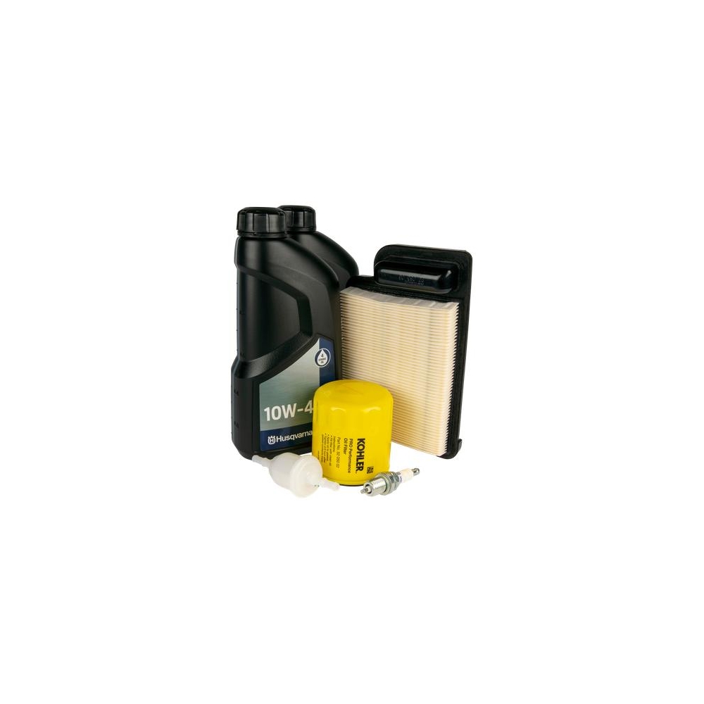 Zestaw do konserwacji traktora zawiera olej WP 4T SAE 0,6 l i 1,4 l, filtr oleju, filtr powietrza oraz filtr paliwa.