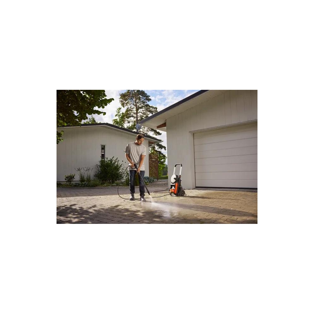 Husqvarna PW 240 to elektryczna i stabilna myjka ciśnieniowa, idealna do czyszczenia i spłukiwania terenów wokół domu. Jest wyposażona w bardzo elastyczny wąż i bęben z prowadnicą do szybkiego i płynnego zwijania. Obsługę dodatkowo ułatwia wbudowany schowek, który zapewnia szybki dostęp do dołączonych akcesoriów, oraz wskazówki dotyczące ustawiania dyszy i ciśnienia, aby uzyskać idealne efekty. Dwa połączenia obrotowe i wielofunkcyjna dysza ułatwiają dostosowanie myjki ciśnieniowej do różnych zadań.