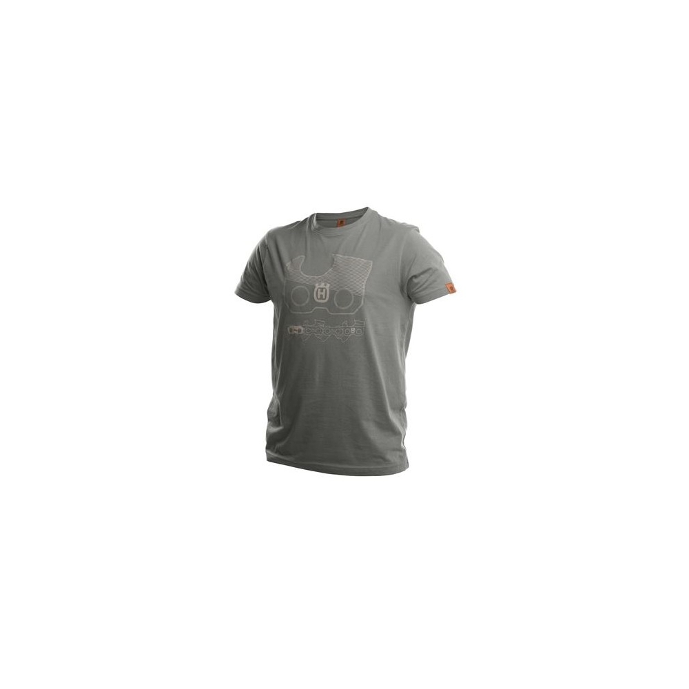 Męska, szara koszulka Explorer z krótkim rękawem. Posiada atrakcyjny rysunek techniczny łańcucha Husqvarna serii X-cut. Wyjątkowa komfortowa, idealna do codziennego noszenia.