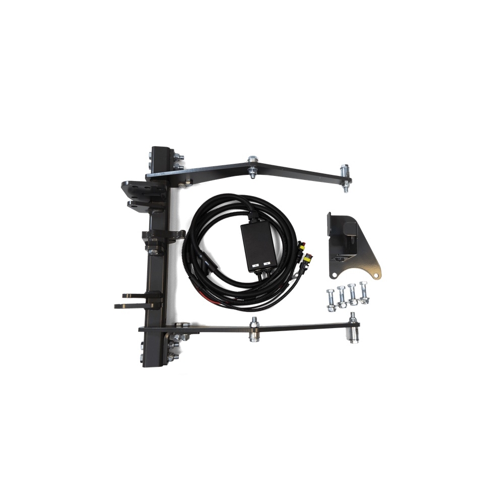 Zestaw do elektrycznego sterowania składanym pługiem. Zawiera wsporniki, elementy mocujące, kable i skrzynkę kontrolną.